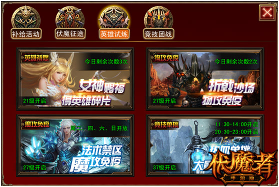 英雄试炼主要是让玩家能够更好的获得英雄碎片与勋章碎片来提升自己战力的地方。
