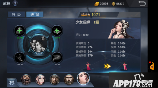武将进阶系统可以通过消耗游戏中各种途径产出的材料对武将的特定属性进行提高,每位武将有四种特定属性,当本阶段特定属性达到顶级的时候,就可以花费将魂对武将进行进阶,进阶后的武将不仅属性远高于未进阶武将,并且其统领的部队阶位也会提高。