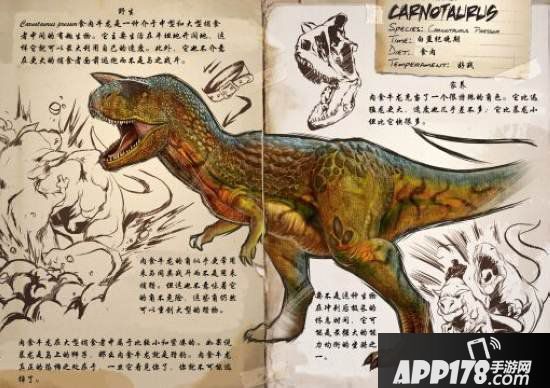 肉食牛龙拥有不错的攻击跟血量前期可以当肉盾使用。玩家要驯服肉食牛龙最好是先驯服一只防御比较高的恐龙当肉盾,同时自己也需要一些护甲,否则扛不住肉食牛龙的攻击。