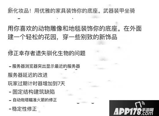 四、这个小编比较不理解,感觉是玩家死亡后的尸体背包消失时间,从3天游戏时间增加到7天;