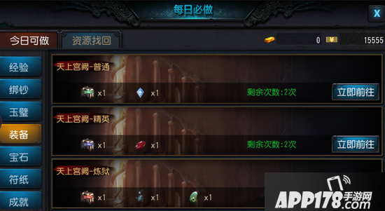 天上宫厥副本一共分为三种模式,分别为普通、精英和炼狱,每天可以各完成2次,每种模式所获取到的装备品质也不一样,而普通模式可以获取到三阶装备。