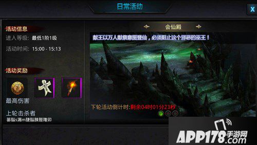 每日15:00,会先殿活动将会开启,所有1阶以上的玩家均可进入会仙殿阻止献王的献祭,