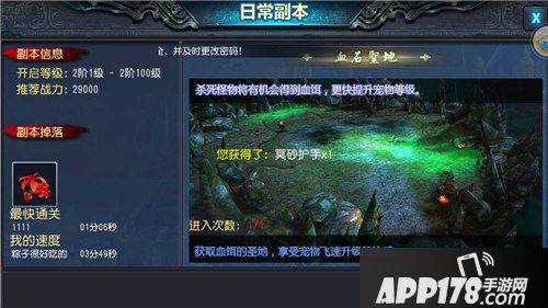 如果你是一个宠物控,那么肯定不能错过《鬼吹灯 3D》的宠物系统,而血饵正是培养宠物的重要资源,这些资源可以从日常副本血石圣地中获取。副本开启的等级为2阶1级-2阶100级,推荐的进入战力是29000。左下角还有显示全服最快通关和自己通关的时间,感受一下和大神的差距吧!