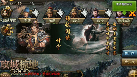 提起张辽张文远,喜欢三国的玩家没有不知道的。吴主孙权曾说:“孟德有张辽,孤有甘兴霸,足可敌矣。”可见甘宁在吴国的地位。《攻城掠地》手游全新版本2.5.0今日震撼上线,为你带来155级全新副本--“夜袭曹营”,同时开放招募武将“真甘宁”,让这位能与张辽匹敌的名将为你而战!同时,还增加晶石进化、搜刮城池、屠城等全新玩法,另外,离线BUFF功能更是让玩家未登陆游戏也能获得对应离线天数的战斗经验BUFF。怎么样,心动了吧?快点拿起手机下载《攻城掠地》吧!