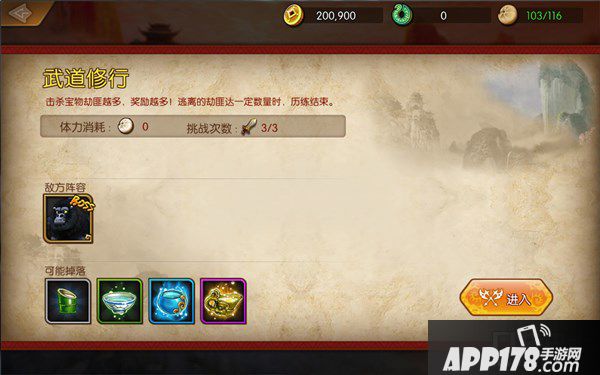 武道修行:尽可能打倒逃跑的宝物劫匪,击倒的劫匪数越多,积分就越高。可获得大量用于大师升级的神秘泉水和历练币。