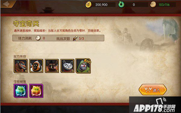 夺宝奇兵:消灭所有的敌人,注意他们的对应属性,灵活运用不同的武器!消灭的敌人越多,获得的积分就越多,可赚取大量神器所需要的材料和武道币奖励!当敌人全灭或角色生命归零时,历练自动结束。