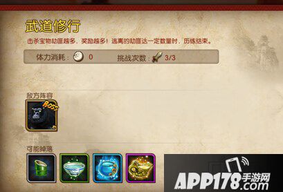 武道修行,尽可能打倒逃跑的宝物劫匪,击倒的劫匪数量越多,积分就越高。可获得大量用于大师升级的神秘泉水和历练币奖励!逃离的劫匪达一定数量时,历练结束。