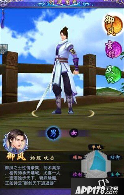 通过职业图我们可以看到,御风派的衣着,十分干练,是修仙一族的经典着装。且衣服以单机游戏中天墉城的着装为原型设计,一贯的白紫风格,使玩家在职业选择界面就有一种熟悉感和亲切感。