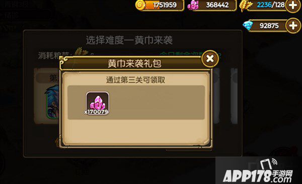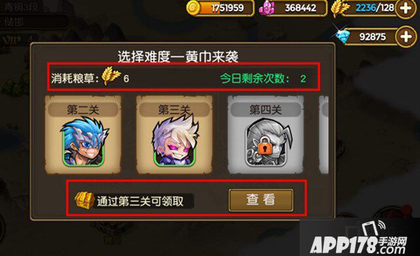 选择“黄巾突袭”可以查看到当前攻打的关卡,同时也可以查看到关卡奖励礼包。需要注意的是,每一次关卡都会消耗一定的粮草,每天攻打的次数也是有限的,主公要千万记得哦~