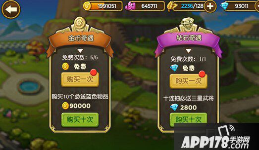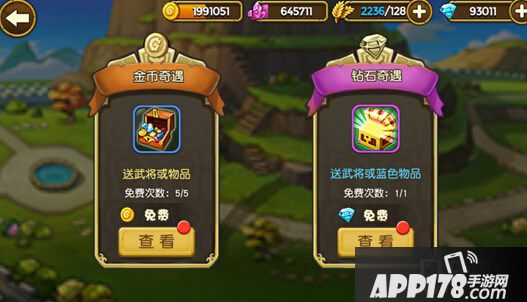金币奇遇每天有五次免费购买的机会,每次间隔10分钟,而钻石奇遇同样每隔一段时间会有一次免费抽取的机会,主公千万不可错过哟。