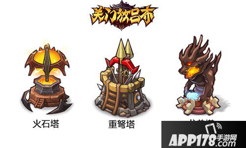 防御塔拥有强大的防守能力,主要用在天下争霸中,由于入侵者可以手动操作武将和使用主公技,所以被侵略者可以放置四个防御塔攻击敌方。防御塔原来共有6种不同形态不同功能的塔,现在新增三种塔,分别是火石塔、重弩塔、龙兽塔。