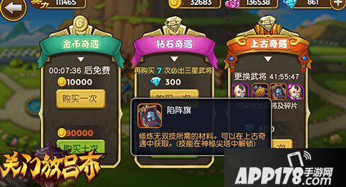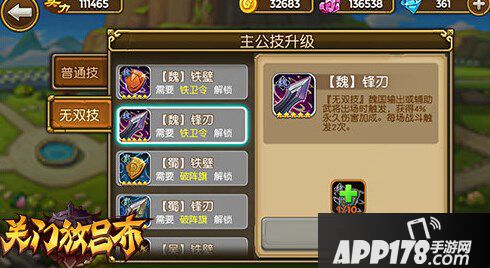 9月底新版本增加的一项玩法,可以满足各位主公对能力的追求。当我们达到VIP11级后,就可以使用钻石在主城点将台的“上古奇遇”中购买到技能解锁道具。针对魏、蜀、吴和群雄4方势力各有2种技能,也就是说收集控可得到8个无双技能。当然,每个技能都将花费相应的10个道具才能解锁。由于技能全部为5星级,获取也有一定难度,所以大家可要量力而行~