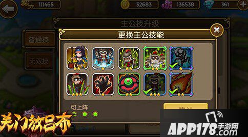主公技能,在主城的神秘箭塔内查看、升级和搭配,分为普通技和无双技两种类型。上战时最大可携带3个普通技,可通过“更换主公技”来配置,而无双技则相当于被动技能,在特定性质的武将出场时就自动触发。主公技能可为武将提供不同的属性加成,可以是出场速度,可以是招小兵,也可以是治疗武将,这些就需要玩家自己选择合适的主公技能。