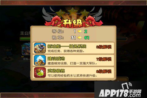 但诸如敌寇攻城、防御城池、战神试炼这几个活动,就没有武将经验啦,请注意!当然,粮草耗费越多的活动,可以让每位出战武将得到的经验也越多!