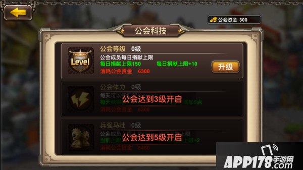 当公会资金达到要求数目后,即可在公会科技中点击升级。公会等级的提升,也将逐步开启公会体力、兵强马壮等其他公会科技,为公会成员带来体力、战力等福利。