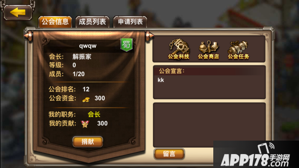 初始公会默认为0级,最多成员为20人,随着等级提升,上限也会提升。通过捐献金币或者钻石来提升公会资金数目,并提升自己的贡献点。