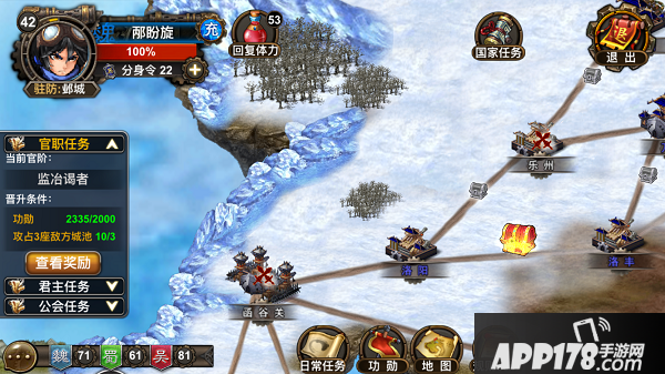 增兵/增兵5次:消耗“增兵符”来复制出一队自己的“分身”军队,分身与本体的战力相同,但不受指挥,只能在该城战斗。只有当您处于战斗队列时才能增兵。