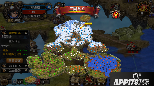到达18级时开启“国战”玩法,点击界面右侧的国战按钮即可进入国战地图。国家阵营是在创建账号时选择的,后期不可更改。总共有255座城池分散在大地图上,分别被魏国(蓝色)、蜀国(绿色)和吴国(红色)的守卫军所把守,玩家的目标是攻占敌方城池并保护己方城池。