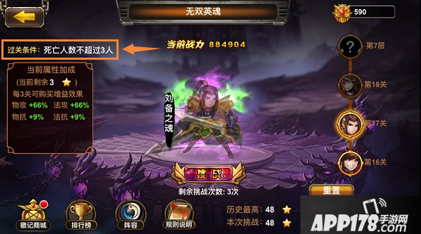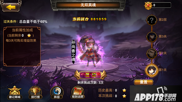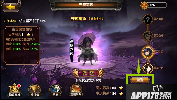 随着层数的提高,敌人变得越发凶残。但是没关系,年轻没有失败,点击重置马上重新开始,每天都有1次免费重置的机会!