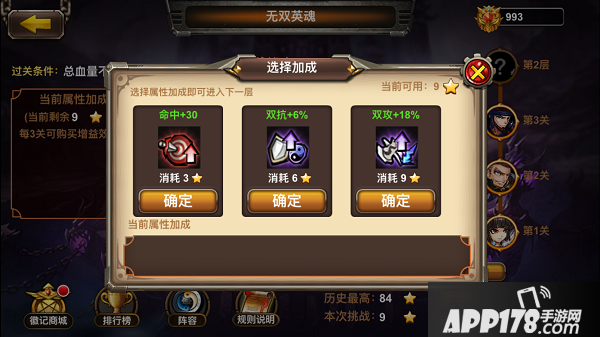 在通往下一层时使用星星来购买永久性的属性增益效果。这里除了要注意根据自己阵容来挑选物攻或法攻之外,还建议您多购买那些增加血量上限的增益,不然后面的路可就难走咯