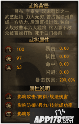 在武将面板中会显示每个武将的武,统,谋三种属性。武属性影响攻击/防御/战法伤害;统属性影响防御/兵力/率技能成功;谋属性影响攻击/技能效果。