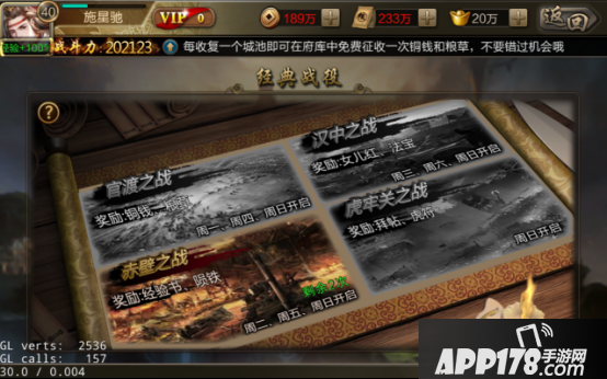 经典战役在每周一、周四、周日时开启官渡之战,成功挑战关卡后将获得大量铜钱与粮草奖励,机会不容错过。