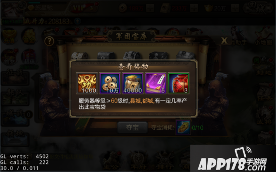 军团宝库会根据军团占领城池数量及规模产出各类宝箱,使用令箭即可进行夺宝,宝箱中会产出大量铜钱及粮草。