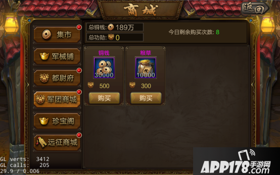 在军团商城中可消耗功勋购买铜钱或粮草,需注意的是商城中每日购买次数有限,且粮草和铜钱共享购买次数。升级军团即可提升购买次数上限。