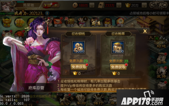 在府库中可征收铜钱与粮草,每成功收复一个城池,即可获得1次免费征收的次数,征收时还有一定几率使获得的资源翻2-3倍。免费征收次数耗尽之后,还可以消耗元宝进行征收。值得注意的是,游戏中会在固定的日期开放府库双倍活动,此时征收可获得双倍资源。