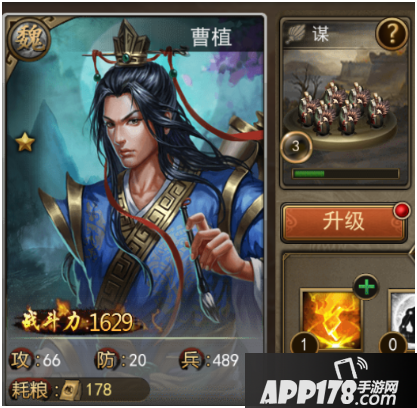 点开武将的详细信息,面板右上方也会出现该武将兵种的类型,如曹植就是【谋】。