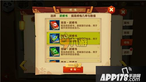 2、武修书要懂得用,不会用就是在太浪费!蓝色武修书在伙伴绿色、蓝色阶段加成最多,平均一次是30点战斗力加成,每次培养不管加成如何,只要加战斗力就确定。紫色和橙色武修书不要轻易用!错了就是浪费元宝。