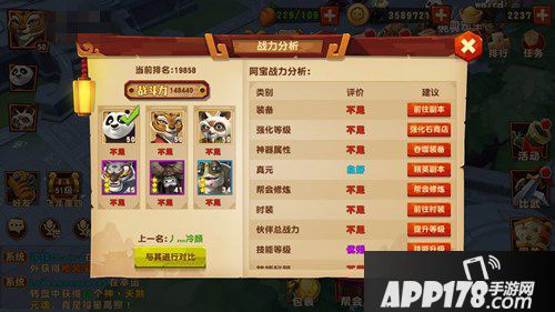 苦于战力不知如何提升,比武竞技总打不赢对手?《功夫熊猫3》电影官方手游“战力分析”全新功能上线,为玩家展示角色各方面的综合能力,快捷摸清自身短板,让提升空缺的能力板块无所遁形。快速提升游戏战力,助你装备、技能、宠物一同发力,突破重重屏障,看到和平谷之上更高更远的碧海晴空!