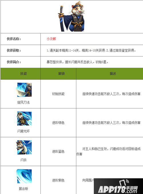 小次郎是功夫熊猫3手游里的暴怒型伙伴,擅长闪避并反击敌人。