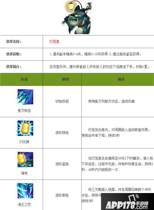 灯笼鱼是功夫熊猫3手游里的生存型伙伴,擅长致盲敌人并在敌人的攻击下逃跑活下来。