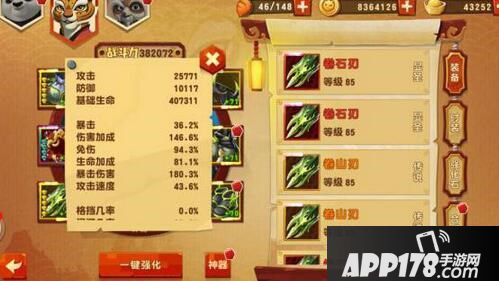 我主要提高的是老虎的八字爪和链爪,八字爪的2个秘籍都5星,链爪坚毅4星,狂怒3星。刷天机阁我用的熊猫的无影腿、泰山压顶、太极拳,老虎的八字爪、链爪、虎爪连踢,师傅的雷、火、水。