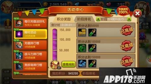 新开的活动里只有显示活动是不用付费的,第一天的时候只提升你需要的英雄的战斗力,3小强,撑过第一天,第二天限时活动开始是提高战斗力得积分。那么在第二天尽量提高你所有英雄的战斗力,能进入前20名都有奖励,有点困难,但是可以试试看。
