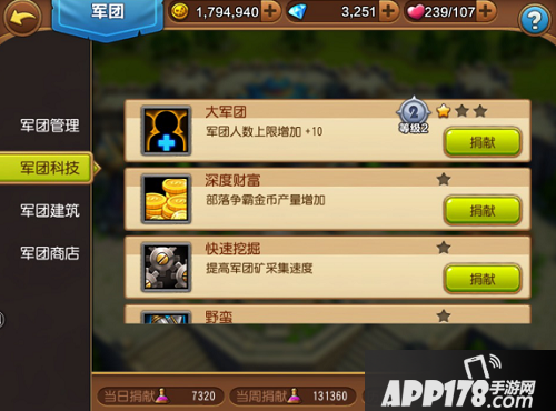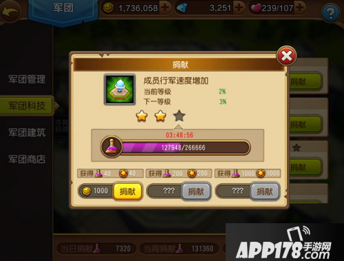 每个科技需要军团所有成员进行货币捐献,每次基础捐献都会增长此科技40的经验值并且获得40军团币,个人也会获得军团积分。军团币可以用于团长或者长老购买军团商店中的物品,然后将此物品放入物品栏供军团所有成员使用军团积分进行购买,这个以后再讲。每次基础捐献都有可能触发中等捐献或者高级捐献,它们有可能使用金币捐也可能是用钻石捐,不过无论是用什么,只要出现就赶快点就是了。比基础捐献合算多了,只是出现的几率不高,要拼人品。