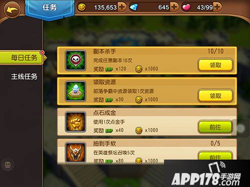 除了用体力值换经验以外,游戏中另外一个升级的办法就是每日任务了,在每日任务中会为玩家提供数量不少的经验值。例如完成血战到底后,即可获得100点经验值,完成一次宝石合成,又可以获得50点经验值。每日上线做完任务,才是升级的快速道路!