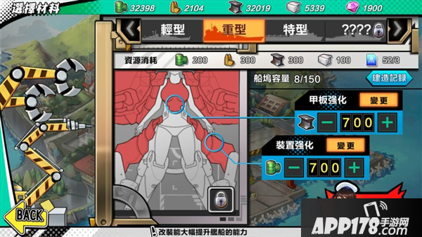 Ø 建造类型:分为轻型舰、重型舰、特型舰、传奇舰4种类型。不同类型消耗固定资源不同,可建造舰船类型也不同。可通过手动追加建造舰船的所需的燃料、弹药、钢材、铝材四种资源数量,获得改类型下种类不同的舰船。