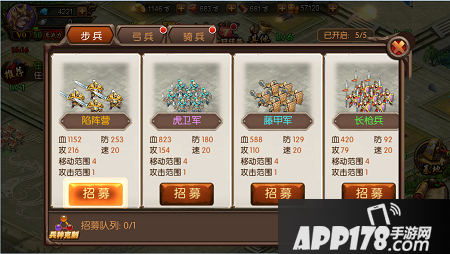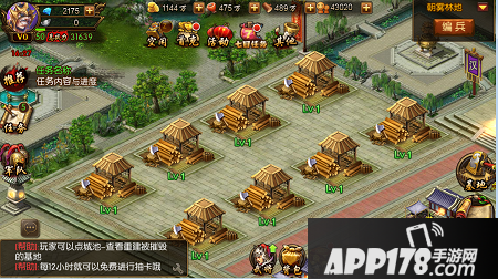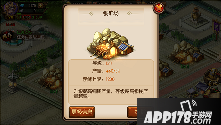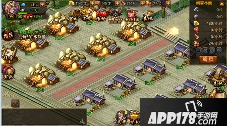 顾名思义,农场负责粮食的产出,伐木场负责木材产出,铜矿场生产铜钱,民居等级决定了人口数量,兵营将是主公招募军队的重要建筑。每个城池内可以打造16个建筑,在铜钱、粮食、木材、人口上如何分配,就需要根据主公的谋略而定!