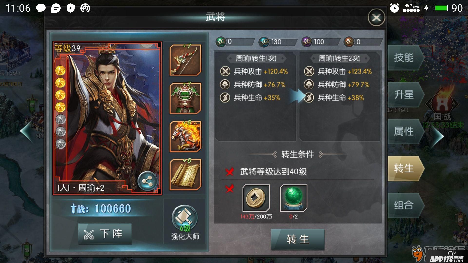 武将的转生需要转生石,获取地点在战功商店,不过需要用经验和军衔来兑换,所以打国战是非常重要的,武将从35开始可以进行转生,每5级可以在转一次,转生可以提升兵种攻击、兵种防御及兵种生命加成。除了转生石还需要大量的铜币进行转生。
