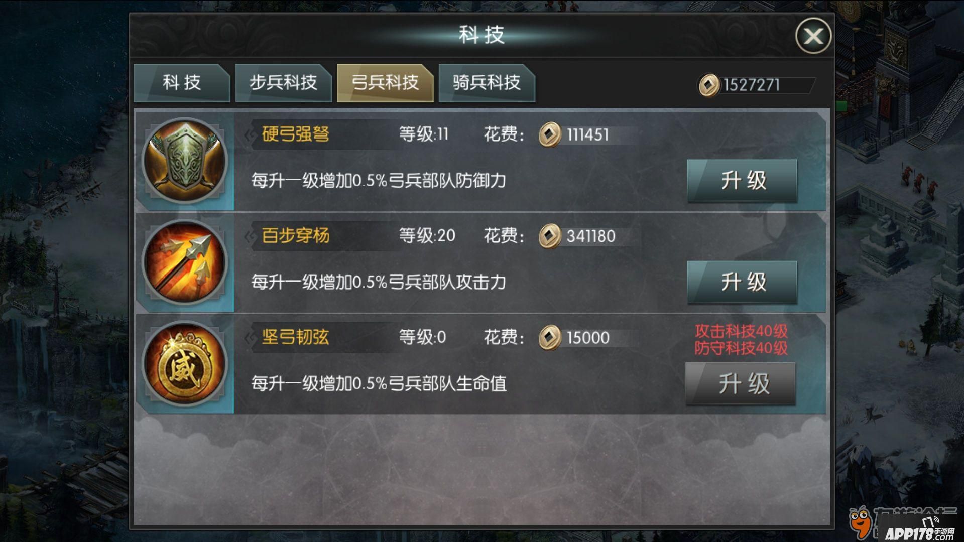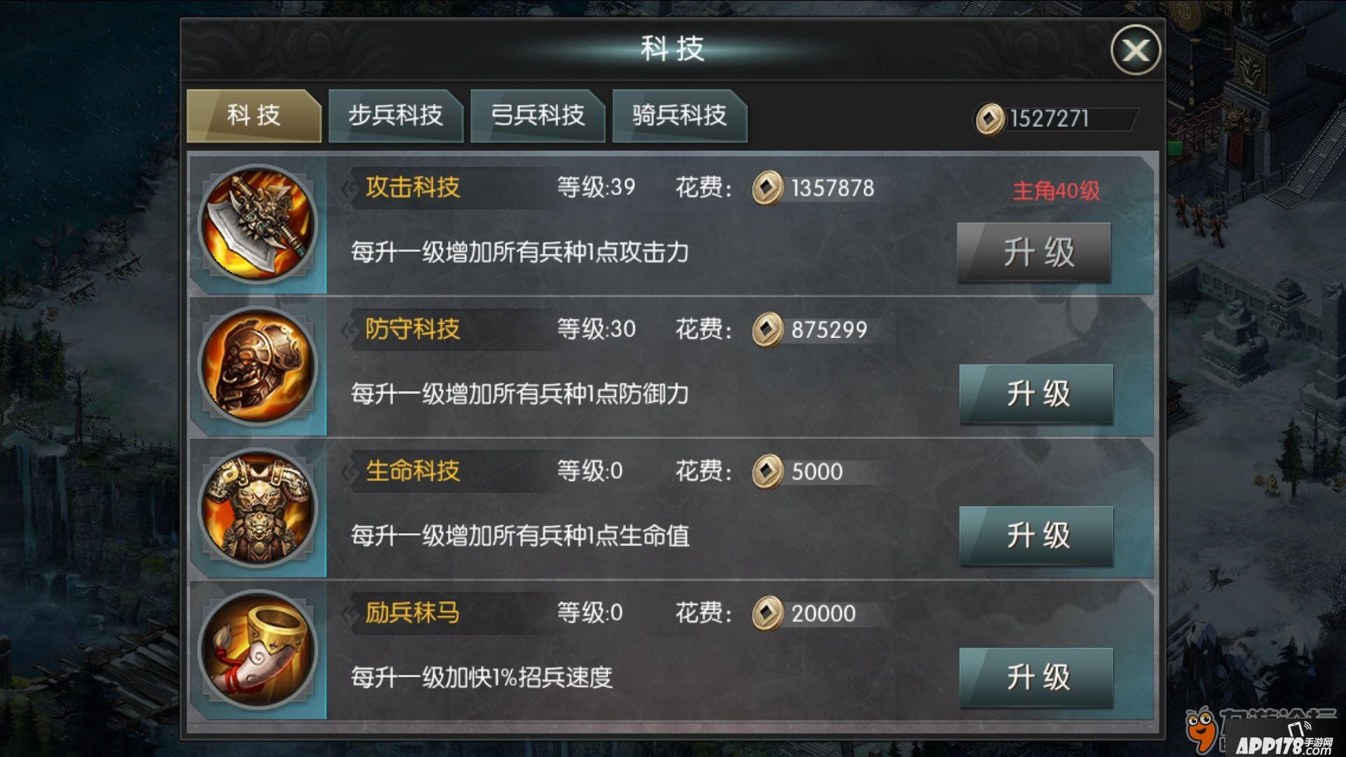 所以这里建议大家通用里面的科技只把攻击科技跟着等级走,防御科技点到30,然后就点你的主修兵种里面的攻击和防御科技了。