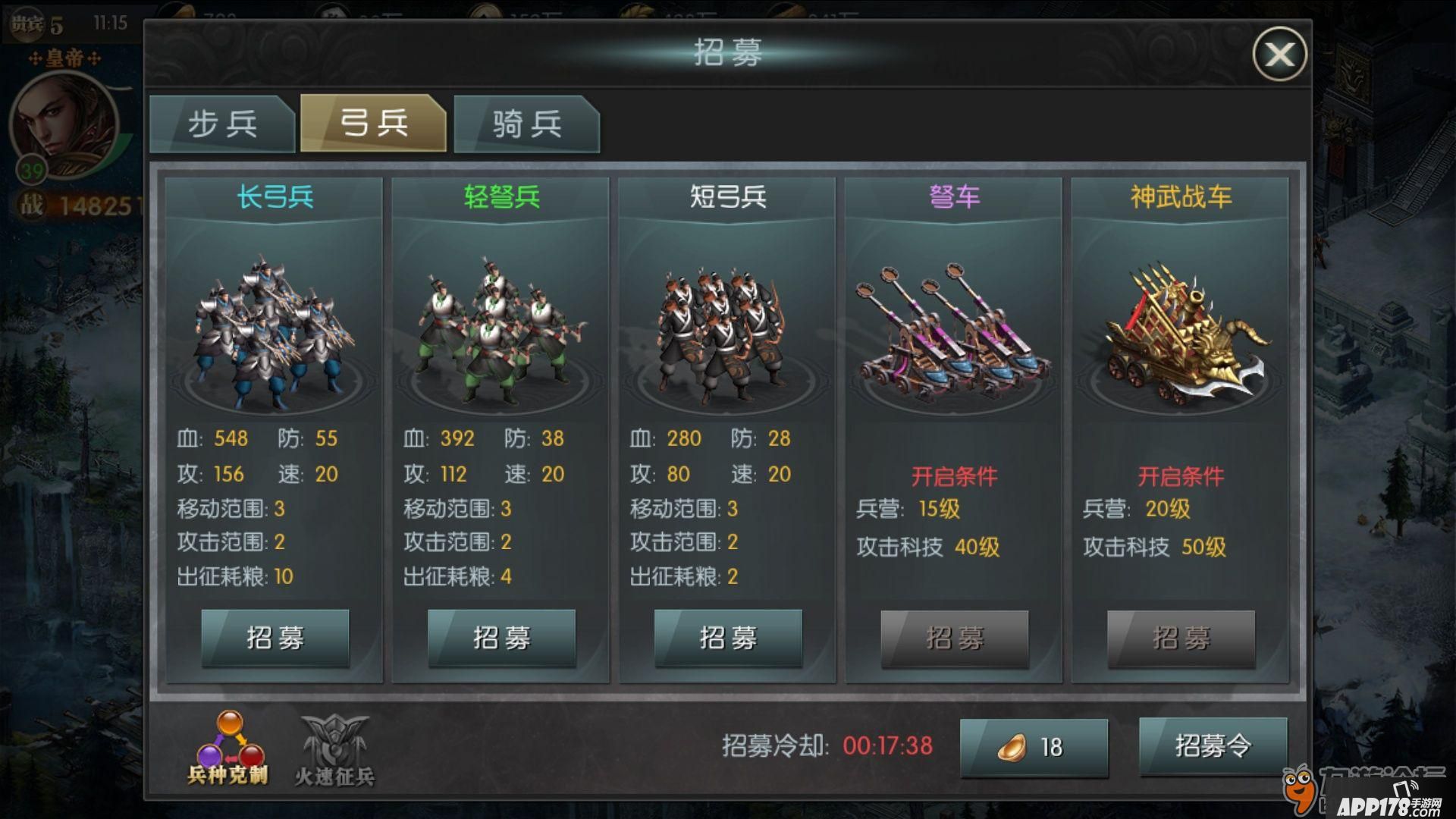这个游戏有3个兵种,分别为步兵、弓兵及骑兵,一般只能单练一个兵种,毕竟升级科技需要的铜钱摆在哪里,单升一个兵种的科技都要穷死你,所以大家在选择兵种的时候先做好准备。