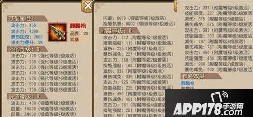 麒麟枪:攻击+12100,暴伤+2000,血量+40000,暴伤减免+900,技能强度+6450,闪避+6000,技能抗暴+8000,减伤+900,攻击力提升5%