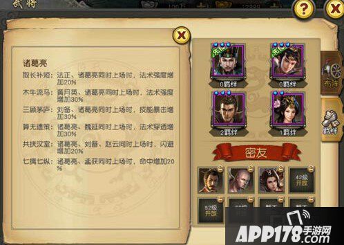 2、在场上的武将和密友相互指南都可以形成羁绊。把等级没有强化的武将放到密友里面去吧,然后开启条件也需要不同的等级。
