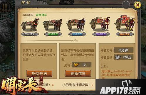 押送镖车当然不是一件简单的事,所经之处均为凶险之地,随时都有可能遇上劫镖的“江洋大盗”。《关云长》手游押送镖车的任务开启后,品质越高的镖车就面临很大的被劫风险,不过也有不挑食的强盗,见到镖车就劫。为了丰厚的奖励,镖师们一定要与强盗誓死拼搏!如果镖车遭到重创,那护送后的奖励也会变少,而劫镖的玩家们就能获取相应的报酬。