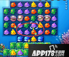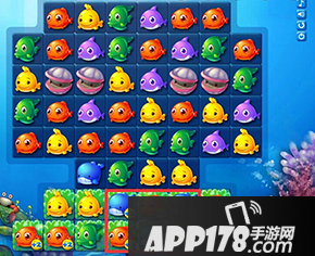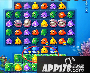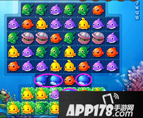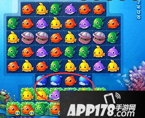 二是让蓝色鱼掉在海藻中,消除其他鱼类让蓝色鱼得到加分的效果(注意不要让蓝色鱼自身被消除了)