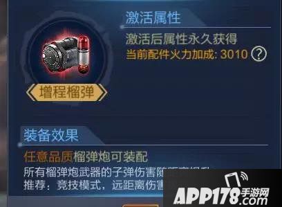 增程榴弹可以装配在任意品质的榴弹炮上,效果为使所有榴弹炮武器的子弹伤害距离提升。
