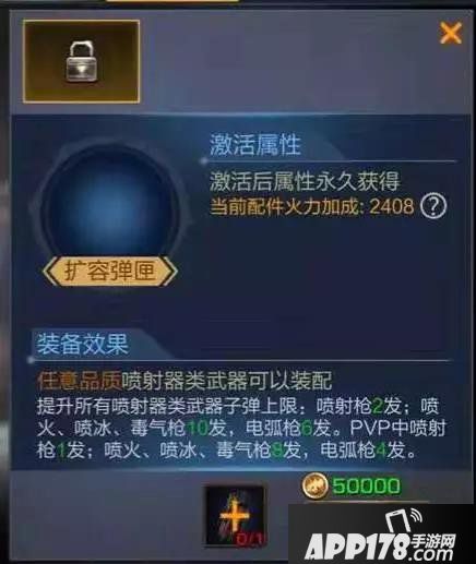 扩容弹夹可以装配在任意品质的喷射器类武器上,效果是提升所有喷射器类武器子弹的上限(根据喷射器类别不同,增加的弹容也会有所区别)。