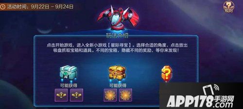 9月22日至9月24日将开放星际寻宝小游戏,大大们将会操作星际飞船释放吸盘,来抓取宝箱获得奖励。
